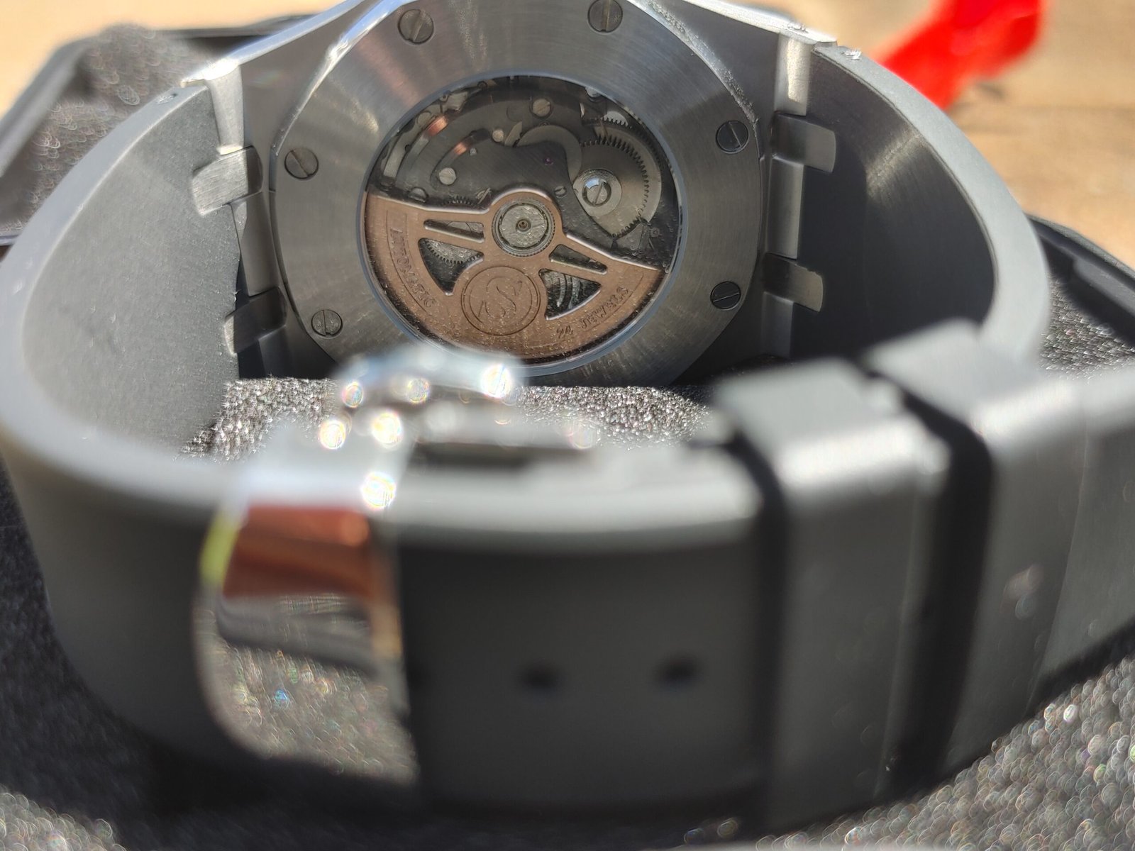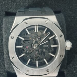 • Exposed Movement: Transparent case back and open dial.